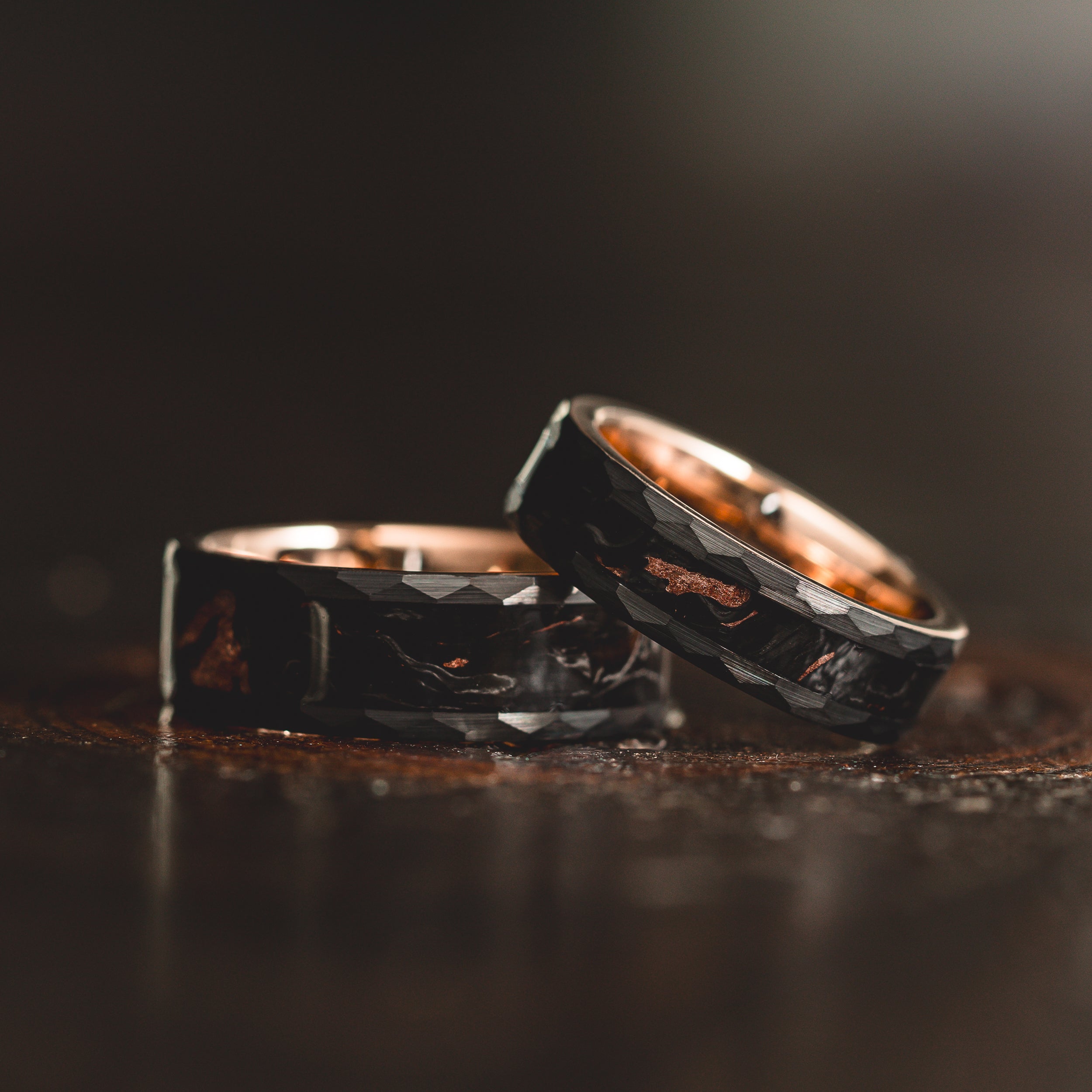 At its center lies a forged carbon fiber inlay accented with rose gold swirls, creating a dark, mysterious appearance that shifts dramatically with light. In low light, the inlay appears deep and nearly black. As light moves across the surface, the carbon fiber weave reveals itself, and rose gold highlights surface like embers beneath forged steel. Every swirl forms organically, ensuring no two rings are ever the same.